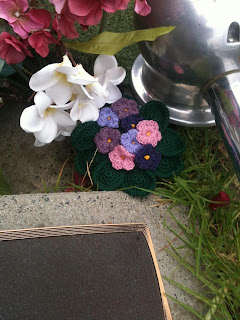 In an attempt to make the day easier for me and to honour all my nan taught me and the love of craft she instilled in me, I decided that I would take time off from squares to create a very special yarn bomb for her. I was planning to do a crochet vase and a flower for myself and each of the kids. However, while searching for vase patterns, I came across a picture of crochet African Violets. My nan always had pots of African Violets on her window sill, so it seemed like the perfect project for her.